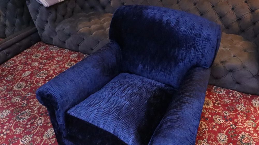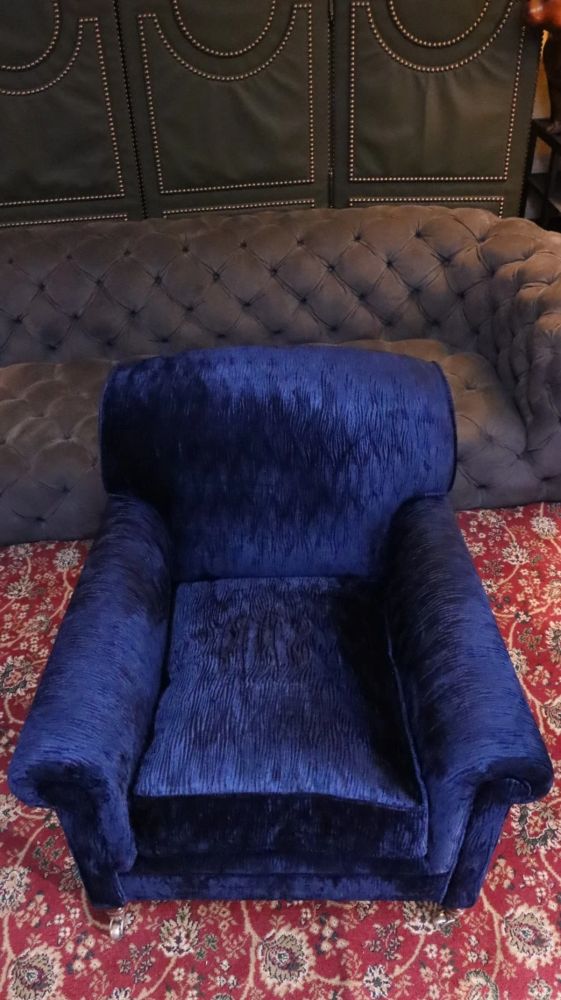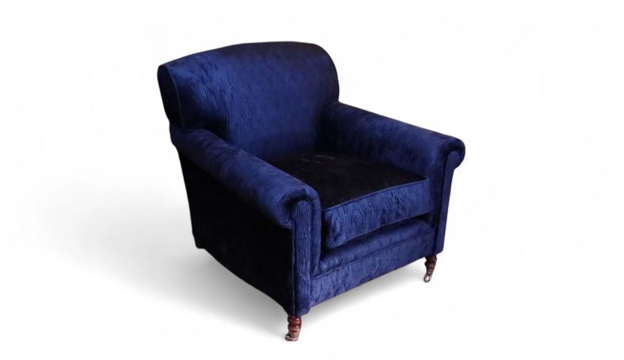 Up for grabs here is a stunning George Smith Full Scroll arm Signature Armchair in beautiful navy blue villandry velvet.