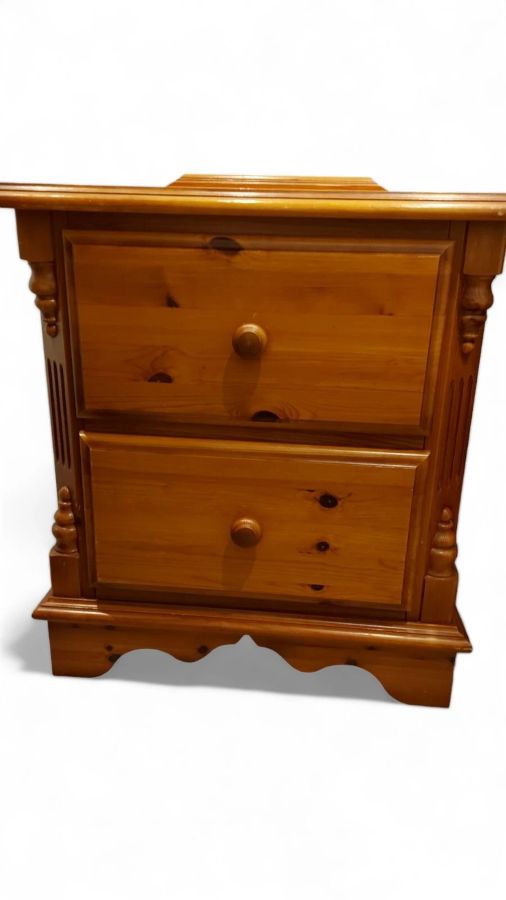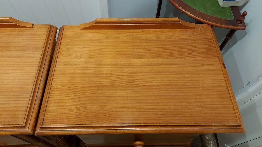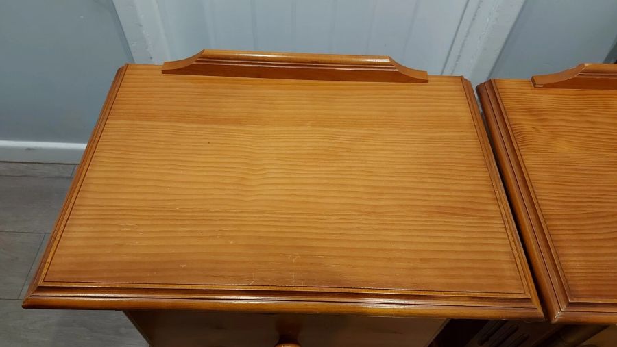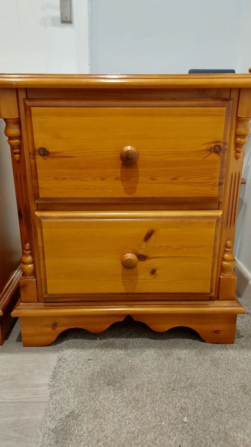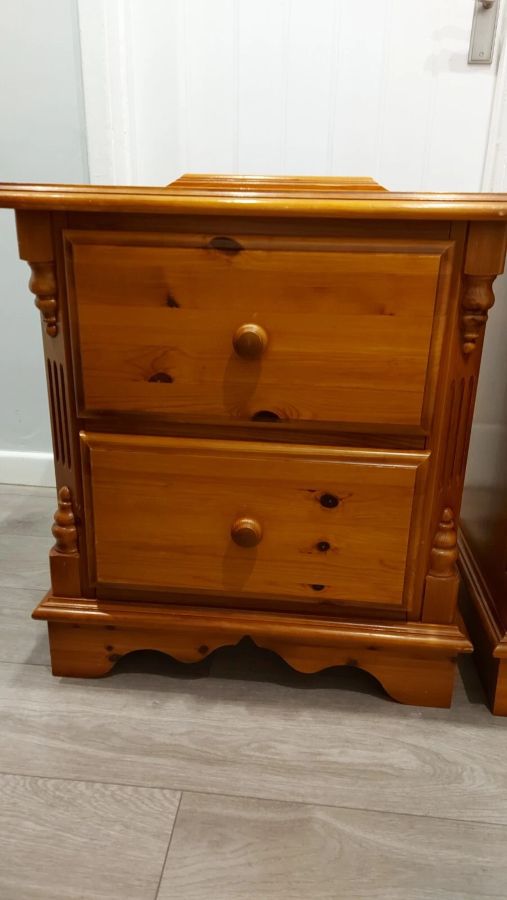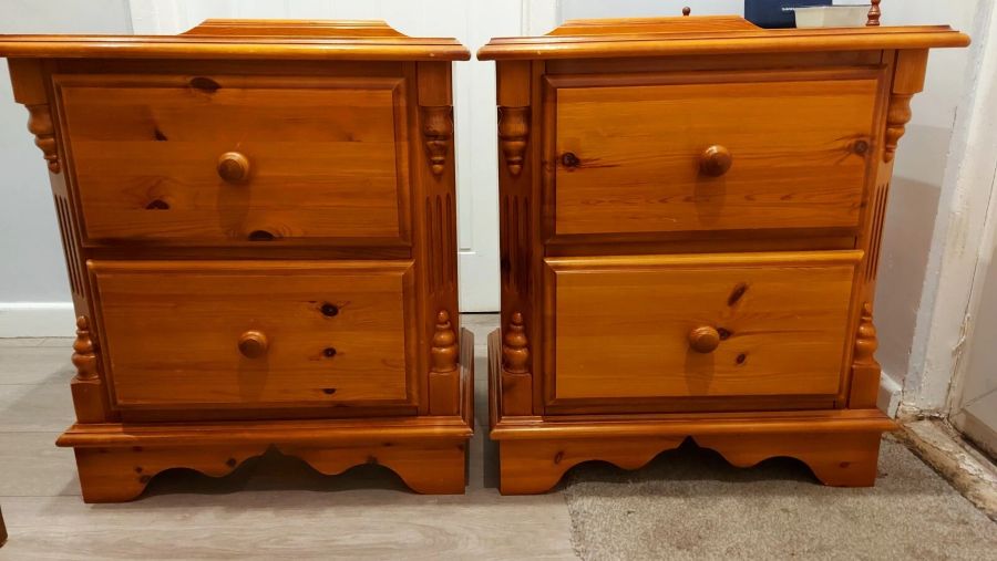 Up for sale here is an impressive large ornate pair of bedside tables. Made with solid pine, these are very heavy.