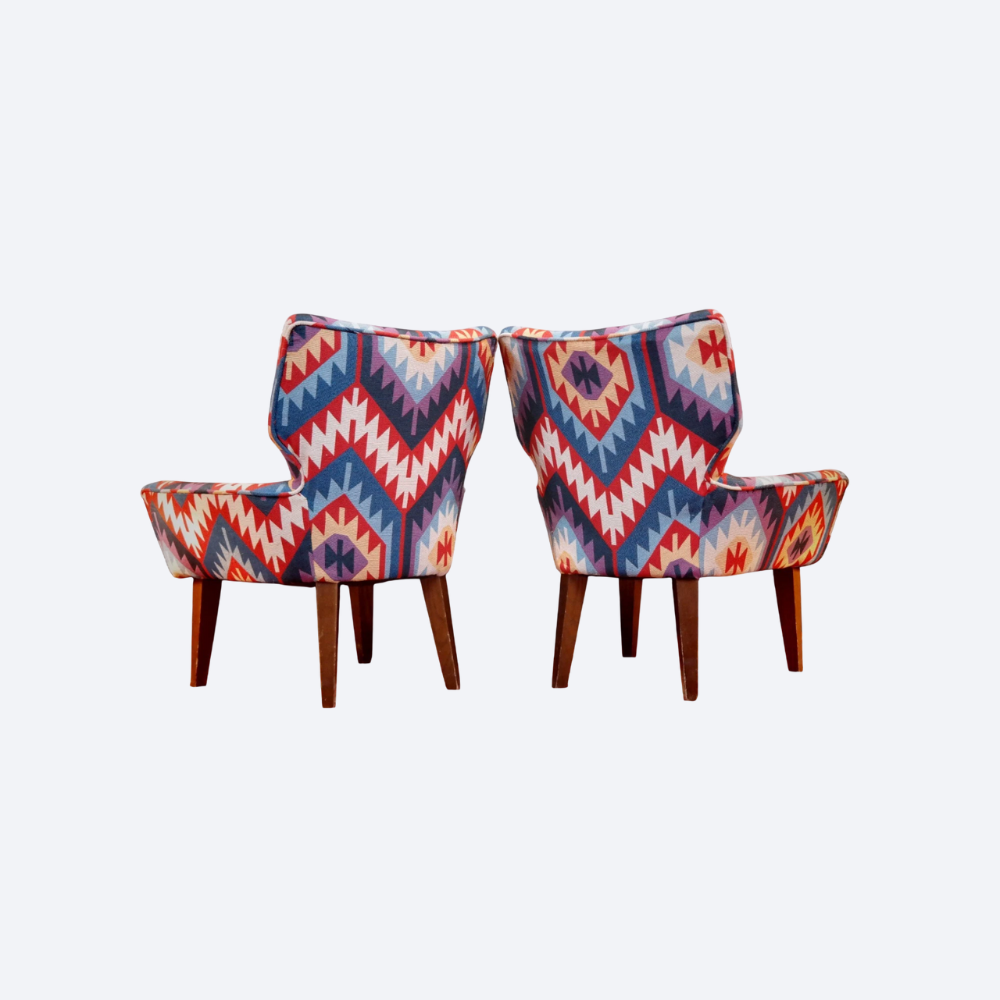 Up for grabs here is a stunning pair of George Smith Bedroom, nursing, or under window Armchairs in Blue / Red / White kilim type of fabric.