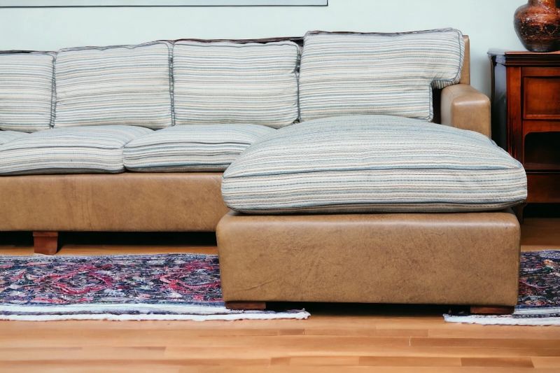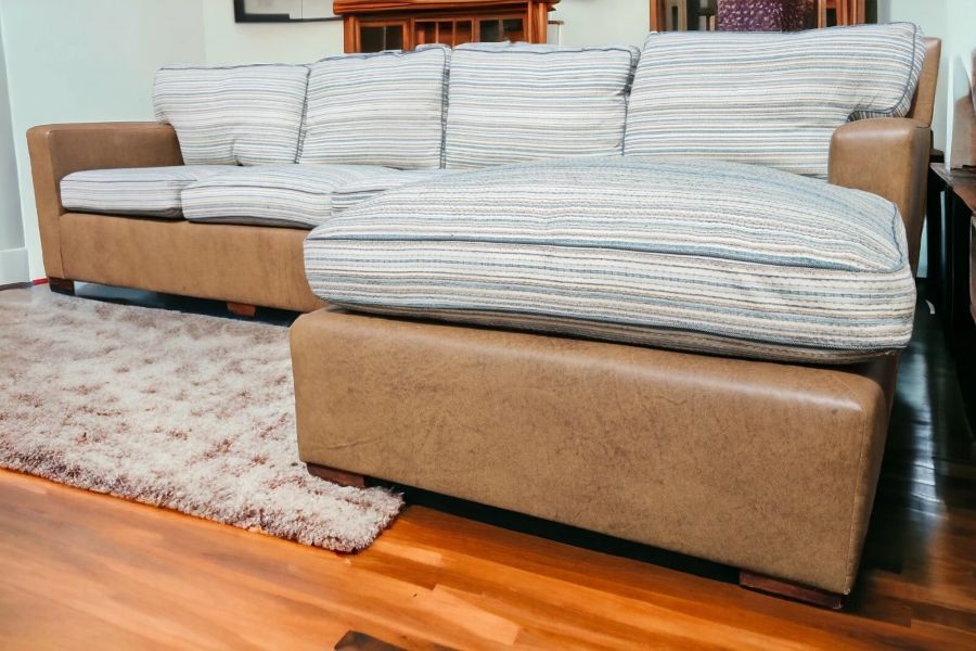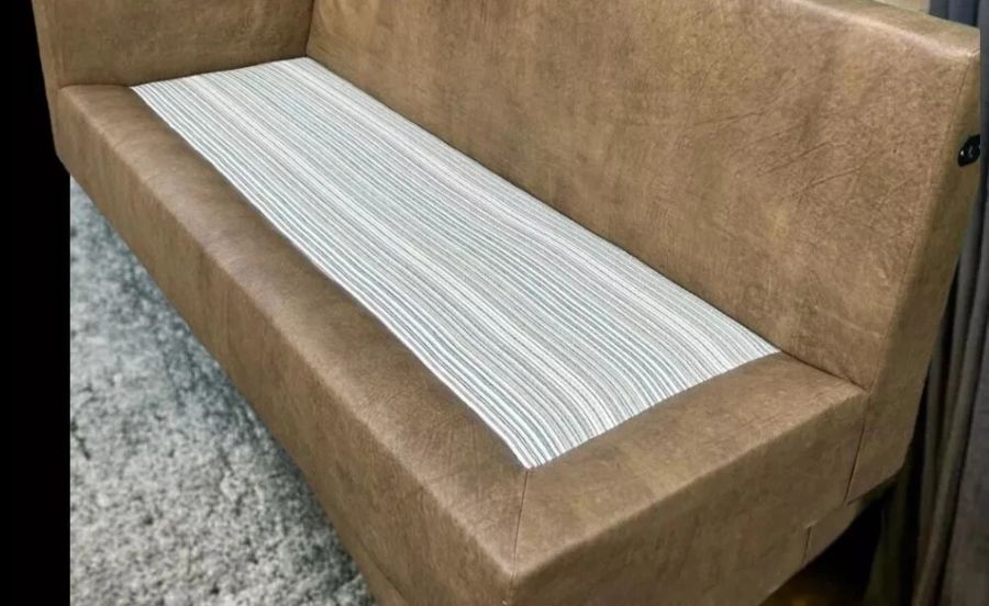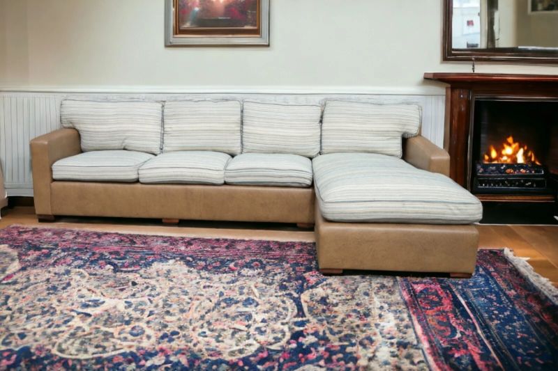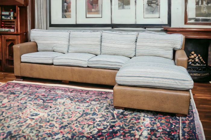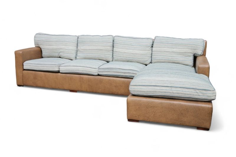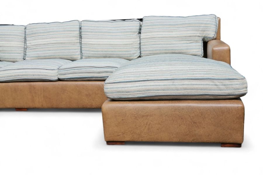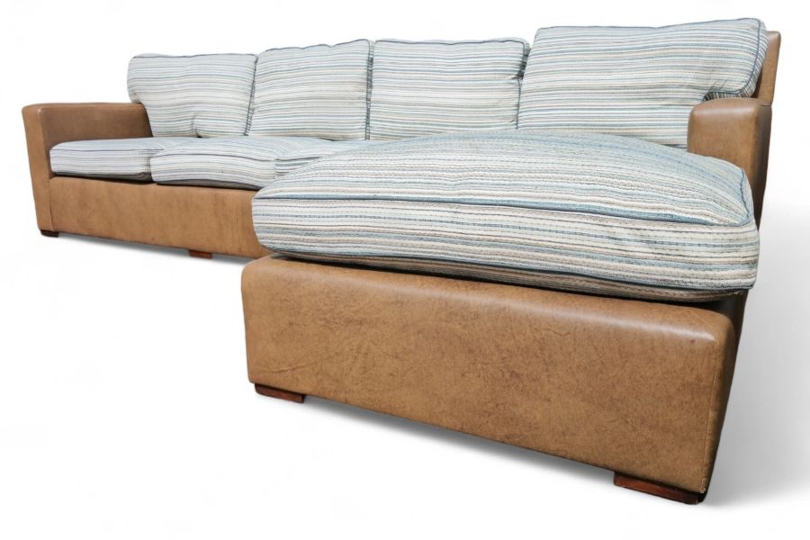 Fabric and colour: Blur the lines birch, azure multi, and city slicker leather in Sand.