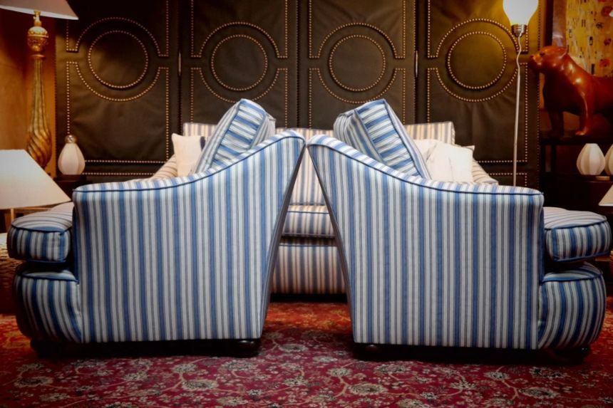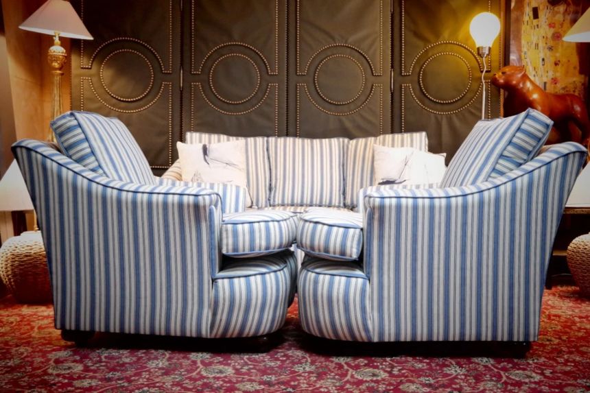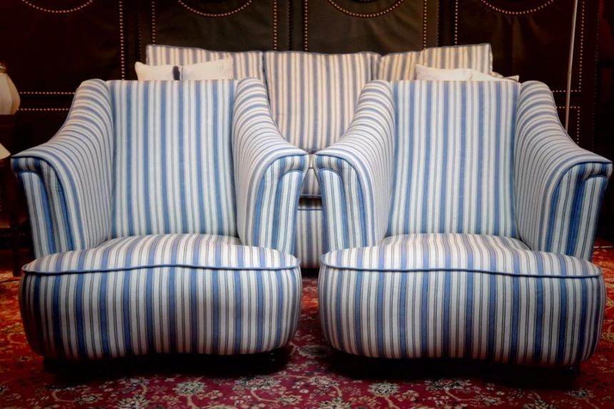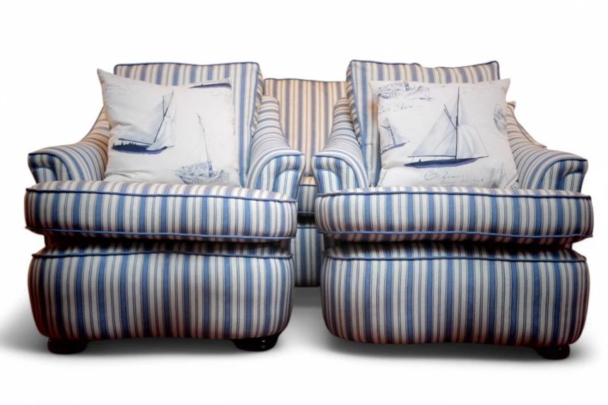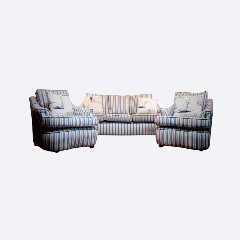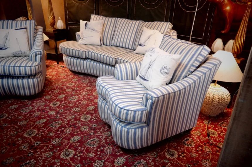 Up for grabs here is a stunning and rare sofa set made in Ticking Fabric by Colefax and Fowler in the manner of Howard and sons. The sofa set offers deep and very comfortable seating.