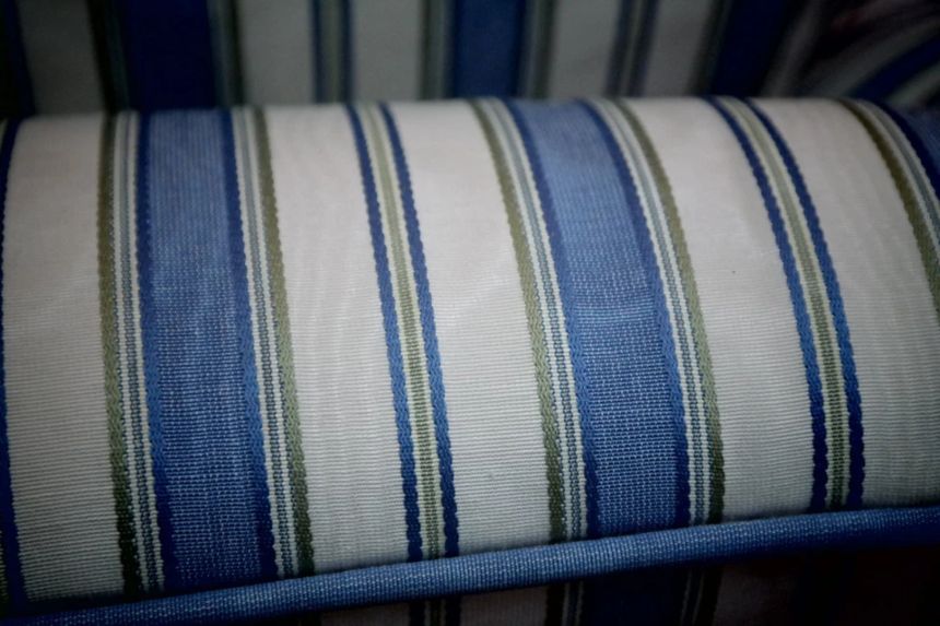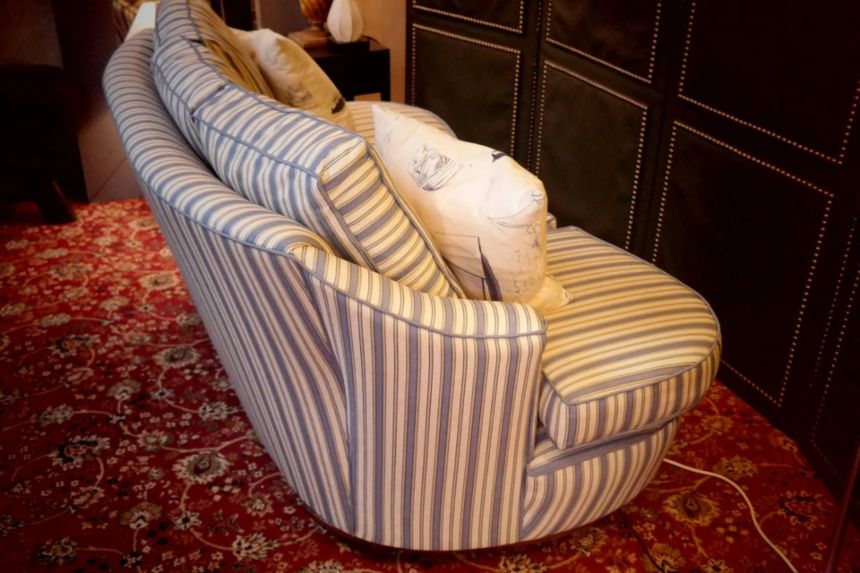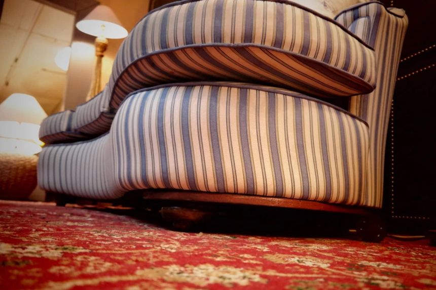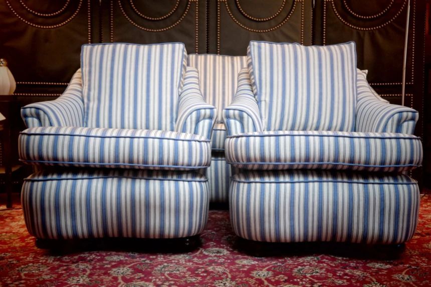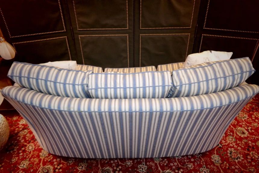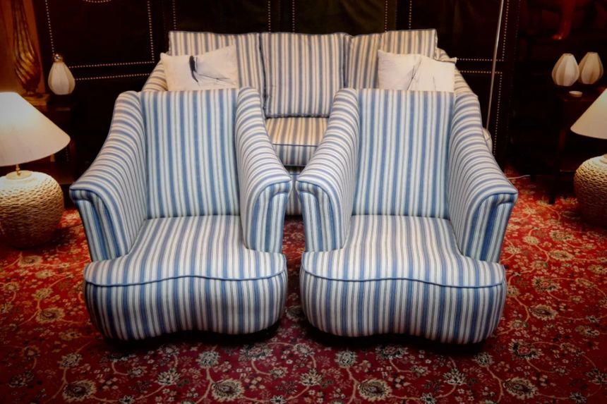 Up for grabs here is a stunning and rare sofa set made in Ticking Fabric by Colefax and Fowler in the manner of Howard and sons. The sofa set offers deep and very comfortable seating.