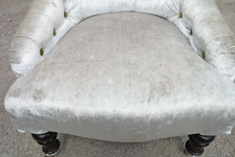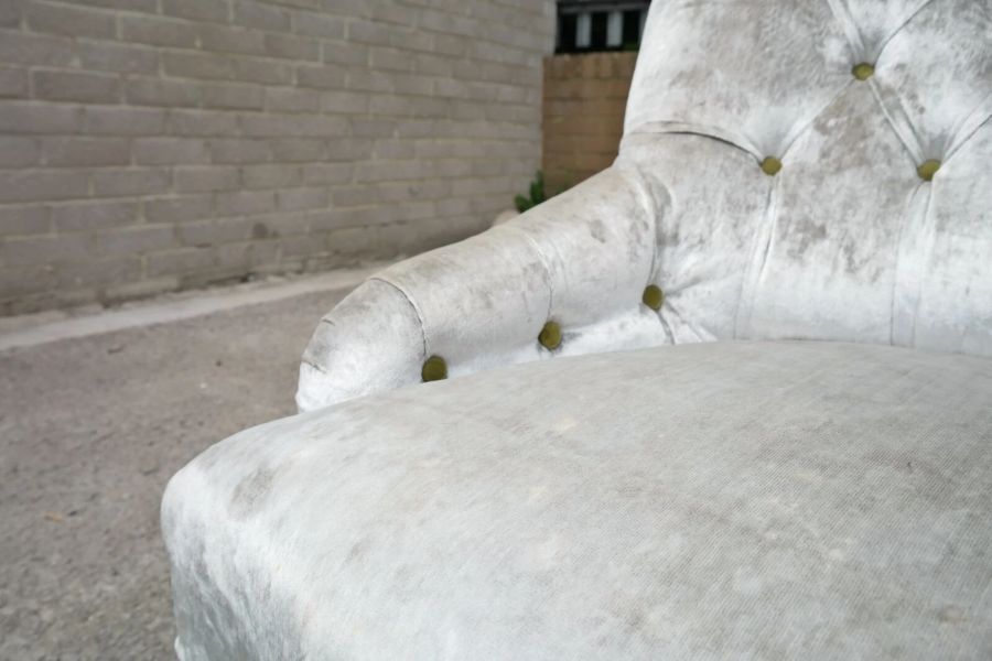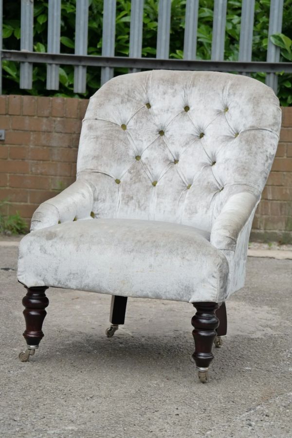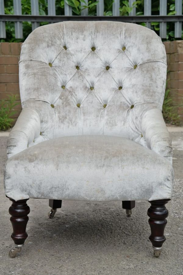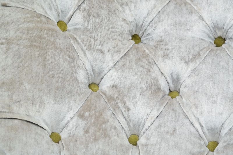Colour and Fabric: Regency Velvet – Pearl with apple green velvet buttons.