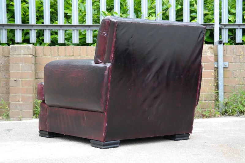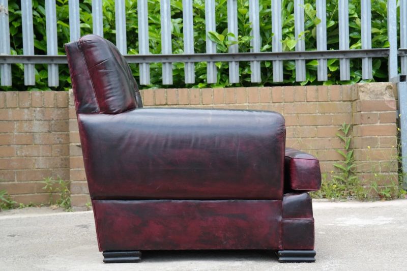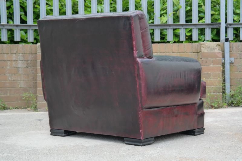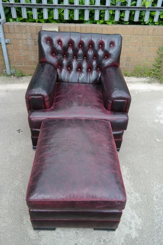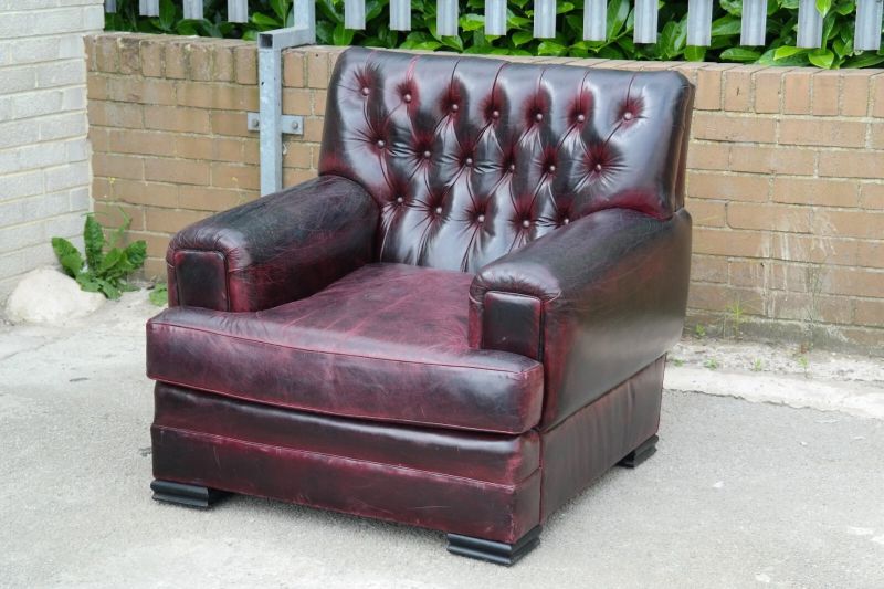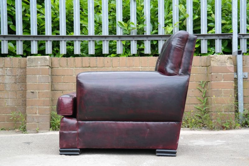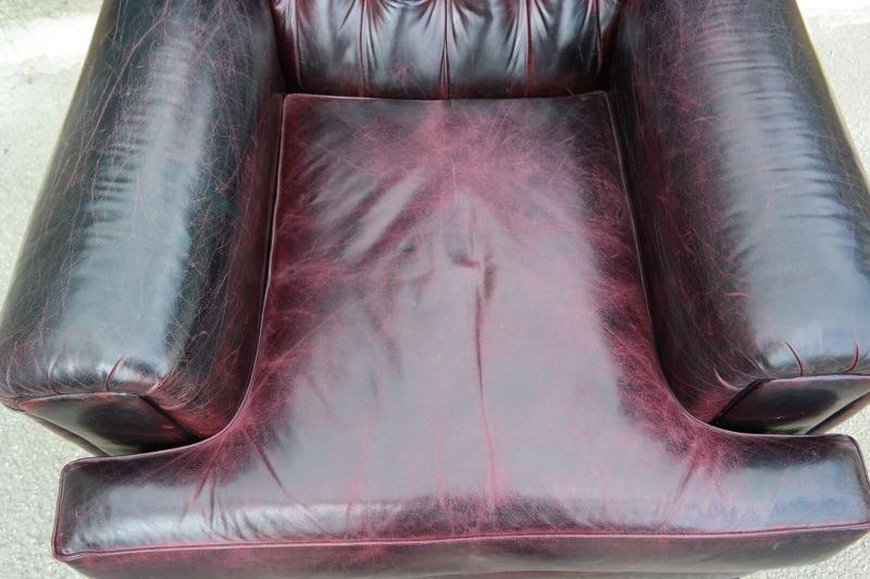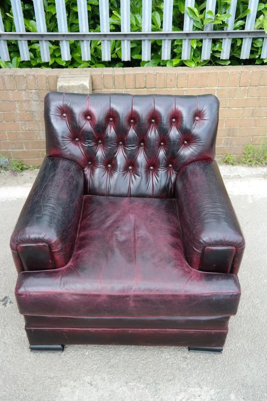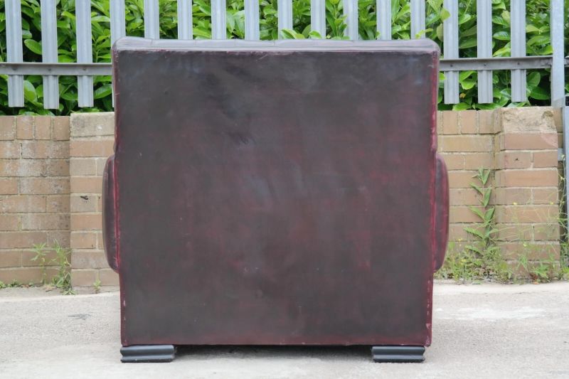 This is an impressive and large armchair with the most beautiful deep burgundy you will ever see. The chair is so comfortable, you’ll fall asleep in it.
