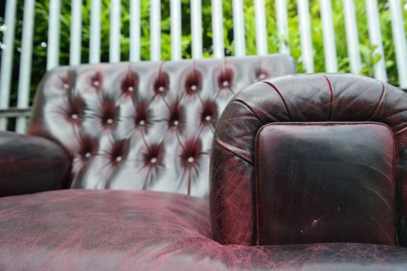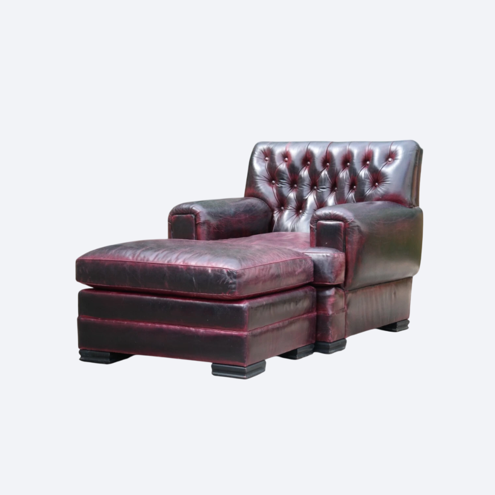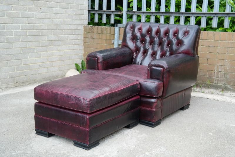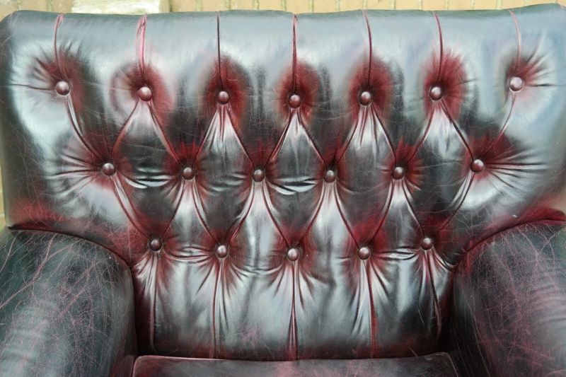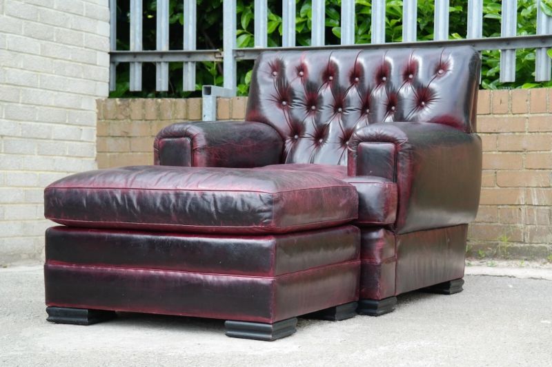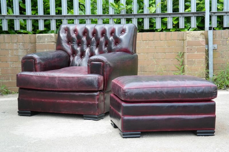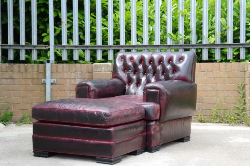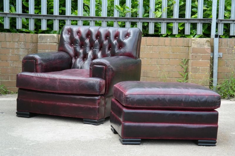 This is an impressive and large armchair with the most beautiful deep burgundy you will ever see. The chair is so comfortable, you’ll fall asleep in it.