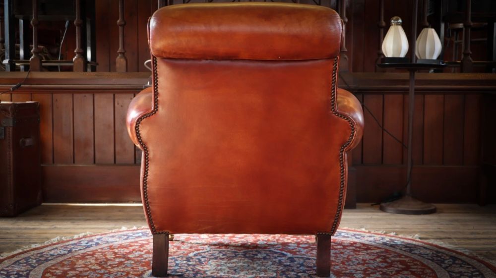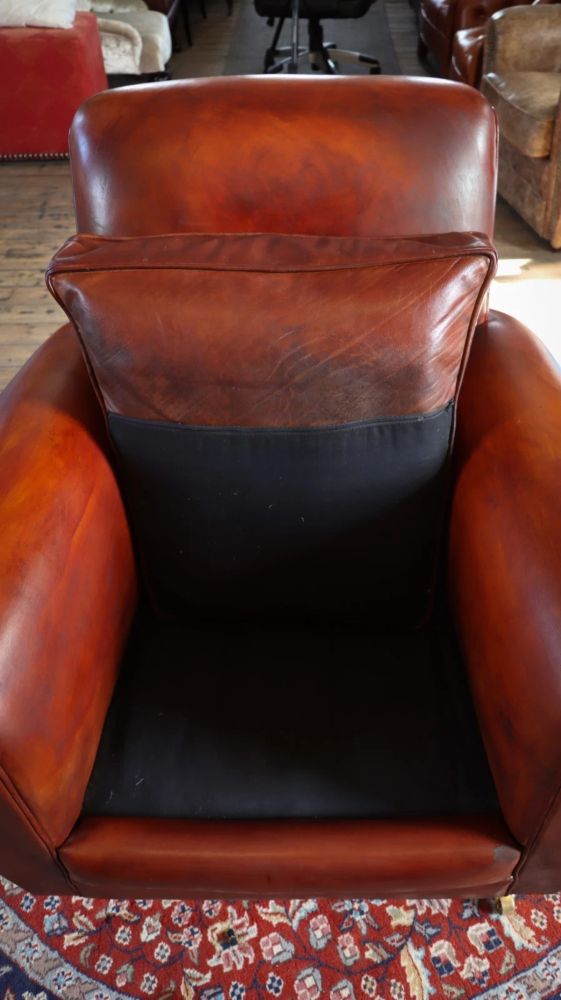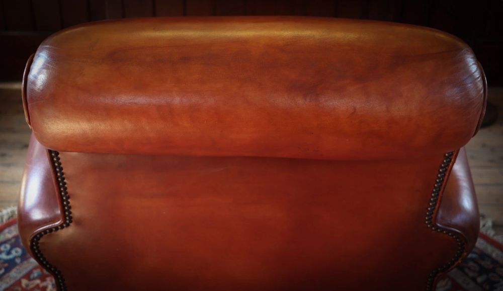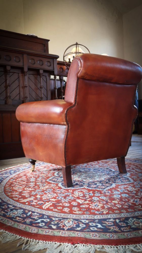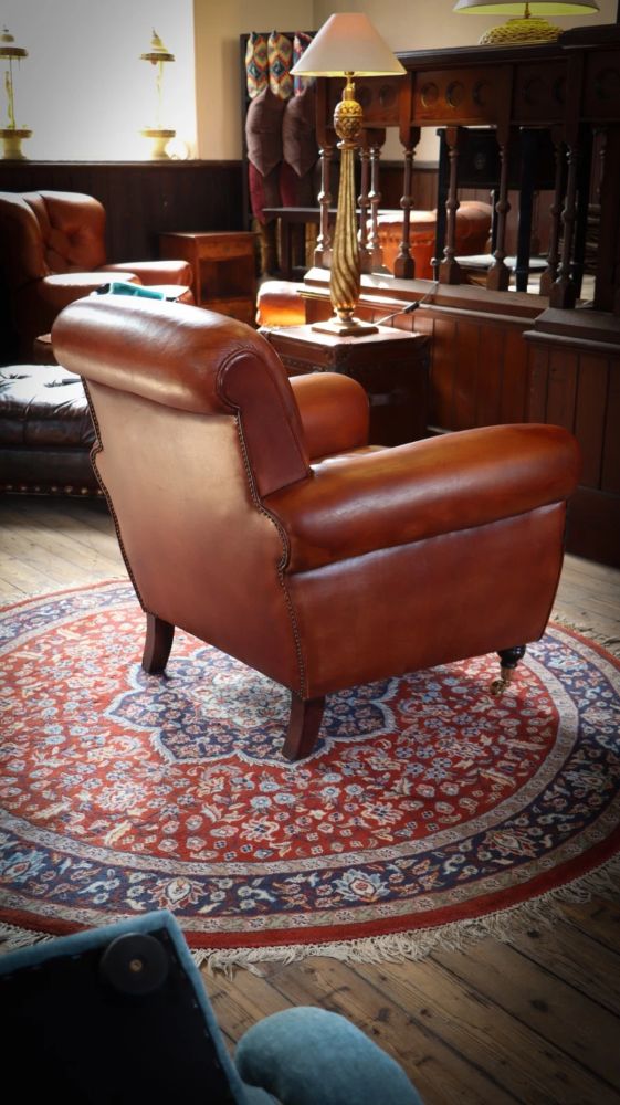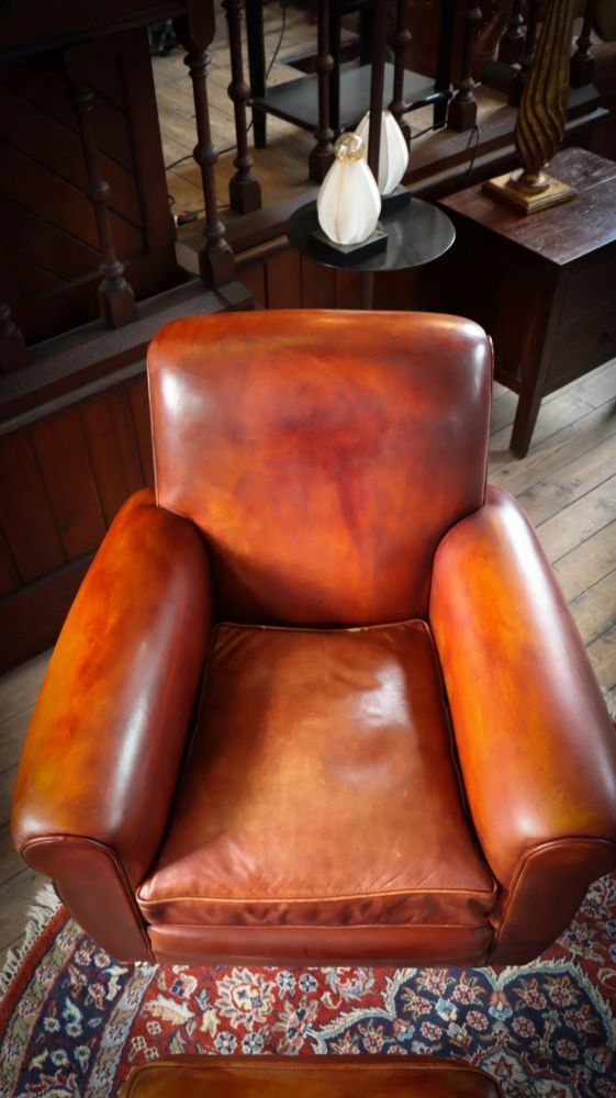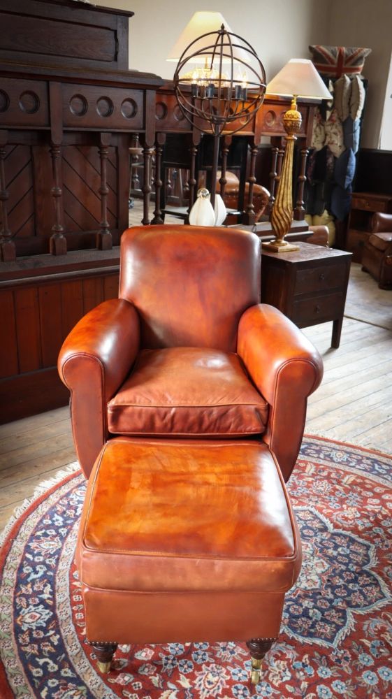 Up for grabs here is a stunning library Cigar club armchair with a matching footstool in semi analine leather from the Chairs of Bath.